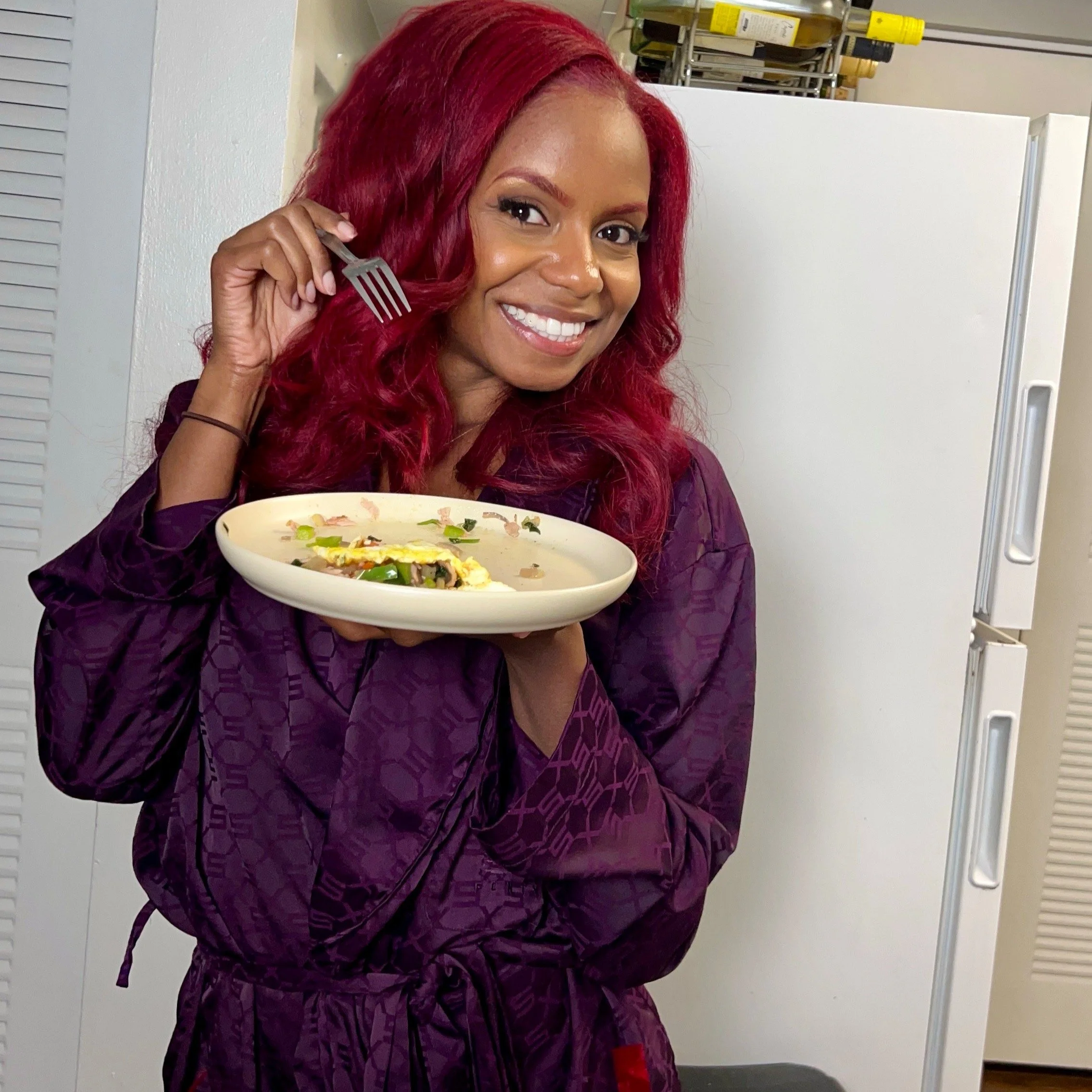 Use the spatula to fold the unfilled side of the omelette over the side with the fillings, creating a half-moon shape…or be fancy & place your fillings in the middle & fold the omelette sides to the middle