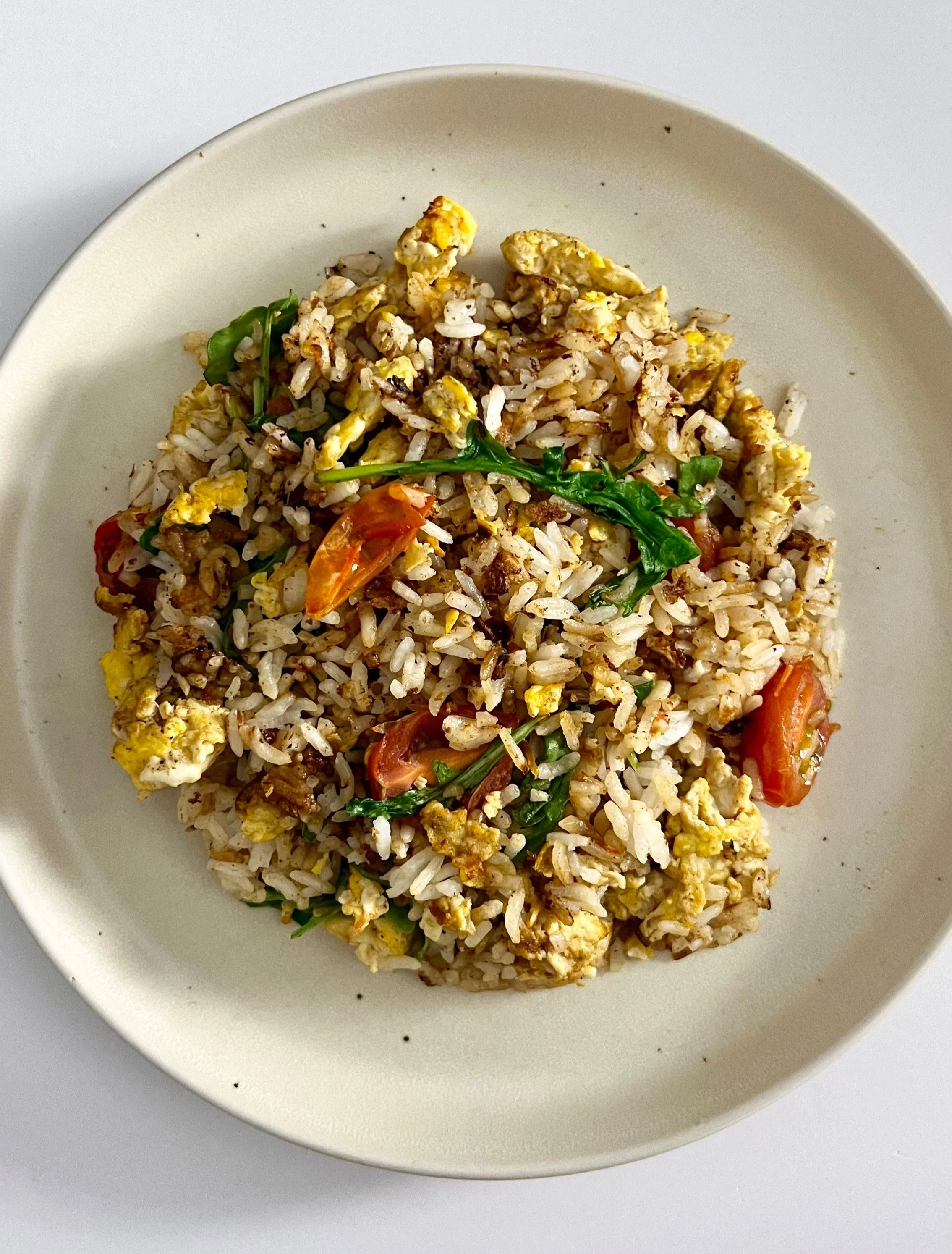 Enjoy your homemade Veggie Fried Rice packed with flavors from arugula, tomatoes, onions, and eggs! Feel free to customize this recipe by adding other vegetables or protein of your choice.